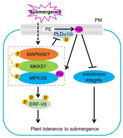 近日,中山大學(xué)生命科學(xué)學(xué)院植物逆境生物學(xué)團(tuán)隊(duì)肖仕課題組揭示,磷脂酶PLDα1和PLDδ受水淹脅迫誘導(dǎo)激活,水解底物磷脂酰乙醇胺(PE)產(chǎn)生PA,而PA作為信號(hào)分子和蛋白激酶MPK3和MPK6結(jié)合,并激活其激酶活性。進(jìn)一步,MPK3和MPK6依賴上游未知MAPKKK和MKK5,磷酸化植物低氧響應(yīng)核心轉(zhuǎn)錄因子RAP2.12,調(diào)控其轉(zhuǎn)錄活性及低氧信號(hào)轉(zhuǎn)導(dǎo)通路(圖1)。同時(shí),長(zhǎng)期水淹導(dǎo)致PA的過(guò)量產(chǎn)生會(huì)造成活性氧(ROS)爆發(fā)、細(xì)胞死亡、及細(xì)胞膜完整性遭到破壞,不利于水淹去除后植物在復(fù)氧過(guò)程中的恢復(fù)生長(zhǎng)。深入研究發(fā)現(xiàn),MPK3和MPK6激酶通過(guò)直接與PLDα1和PLDδ蛋白互作,磷酸化并負(fù)反饋調(diào)控其蛋白水平,從而維持低氧下合適的PA水平和細(xì)胞內(nèi)穩(wěn)態(tài),保護(hù)植物在復(fù)氧過(guò)程中正常的生長(zhǎng)發(fā)育(圖1)。該研究首次揭示了由PA-MPK3/6-RAP2.12模塊介導(dǎo)植物低氧信號(hào)鏈的新機(jī)制,對(duì)完善植物低氧信號(hào)轉(zhuǎn)導(dǎo)機(jī)理和作物抗?jié)尺z傳分子改良具有重要意義。