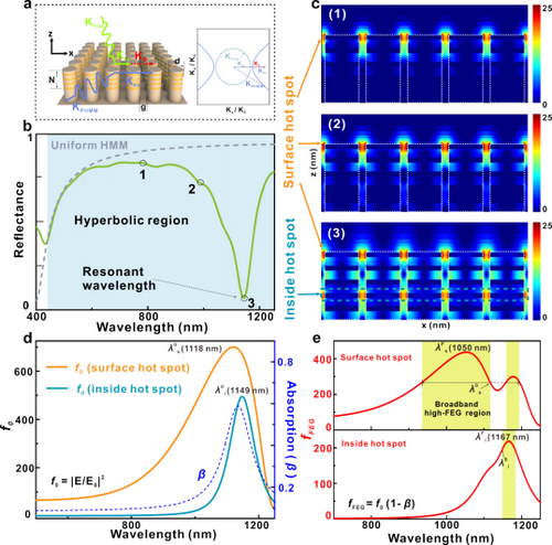 圖1 陣列雙曲超結構中的共振模式與場增益模式對比