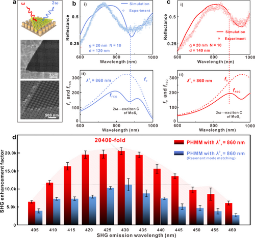 針對上述問題,他們首先在理論上提出考慮系統吸收損耗的場增強增益因子和最佳場增強增益模新概念,以實現比傳統共振模式更好的光學響應增強。傳統上,人們采用場增強因子f0(λ)= |E(λ)/E0(λ)|2(E(λ)和E0(λ)分別表示當波長為λ時,光子學系統中的總光場振幅和入射光場振幅)尋找共振模式(共振波長即為使f0(λ)取最大值的波長,記為λ0),作為光與物質相互作用增強的最優選擇。但共振模式往往伴隨最大的吸收損耗,會顯著減少實際參與光與物質相互作用的光子數,從而大大降低共振模式帶來的光學響應增強的實際效果。為此,他們提出場增強增益因子新概念fFEG(λ) = f0(λ)[1-β(λ)](β(λ)為光子學結構對于波長為λ的光子的吸收率),以尋找最佳場增強增益模(fFEG(λ)取最大值的波長即為最佳增益模的波長,記為λF)用于增強光與物質相互作用。理論模擬發現:不僅最佳場增強增益模比共振模式有更顯著的光學響應增強,而且存在一個比共振模式更強的光學響應增強寬帶區,如圖1e所示。為實驗證明場增強增益概念的有效性,他們通過單層MoS2與陣列雙曲超結構相互作用的非線性光學響應,演示了存在一個比共振模式更強的非線性響應寬帶區,且最佳場增強增益模可導致超過20000倍的二次諧波信號增強,約為相同條件共振模式所產生二次諧波增強的2倍,如圖2所示。