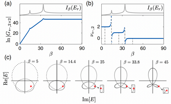 上圖為非厄米系統(tǒng)穩(wěn)態(tài)響應(yīng)中的量子化平臺(tái)。(a)穩(wěn)態(tài)響應(yīng)強(qiáng)度隨耦合參數(shù)的變化。(b)穩(wěn)態(tài)響應(yīng)強(qiáng)度變化率出現(xiàn)量子化的平臺(tái)。(c)對(duì)應(yīng)非厄米哈密頓量的復(fù)能譜結(jié)構(gòu),其關(guān)于所選參考點(diǎn)的卷繞數(shù)等于(b)中平臺(tái)高度。