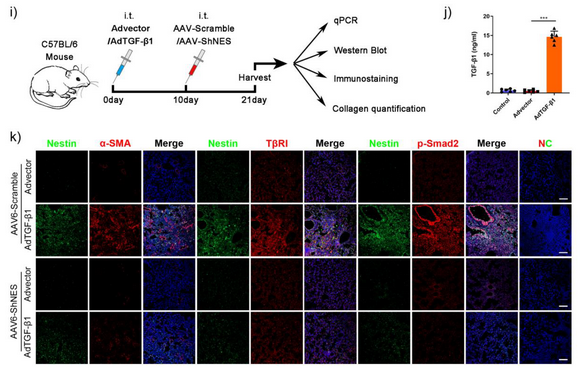 特發(fā)性肺纖維化(idiopathic pulmonary fibrosis,IPF)是一種嚴(yán)重的慢性、進(jìn)行性不可逆肺間質(zhì)纖維化疾病,目前全球約有100萬IPF患者,5年生存率僅為30%-50%,平均生存期不足3年,尋找和發(fā)現(xiàn)IPF的治療靶點(diǎn)迫在眉睫。項(xiàng)鵬教授團(tuán)隊(duì)前期發(fā)現(xiàn)細(xì)胞骨架蛋白Nestin通過調(diào)控線粒體、核膜、氧化還原系統(tǒng)的結(jié)構(gòu)與功能在細(xì)胞內(nèi)環(huán)境穩(wěn)態(tài)維持中扮演了關(guān)鍵角色(Nat Commun. 2018, 2019);在器官損傷修復(fù)過程中,組織原位Nestin+間質(zhì)細(xì)胞的過度增殖會(huì)導(dǎo)致纖維化的發(fā)生(J Hepatol. 2021) ,其是否參與了IPF的發(fā)生發(fā)展亟待闡明。研究團(tuán)隊(duì)首先對(duì)肺纖維化小鼠模型和IPF患者肺組織標(biāo)本檢測(cè)發(fā)現(xiàn)Nestin表達(dá)顯著上調(diào),且高表達(dá)Nestin的患者肺功能更差;進(jìn)一步利用體內(nèi)外模型發(fā)現(xiàn)Nestin可通過調(diào)控Rab11的活性影響TGF-β Receptor I(TβRI)受體回膜,過表達(dá)Nestin可促進(jìn)TβRI循環(huán)激活TGF-β/Smad 信號(hào)通路,干擾Nestin后TβRI進(jìn)入溶酶體降解增多,循環(huán)回膜比率明顯減少,提示Nestin-Rab11-TGF-β信號(hào)通路可能在肺纖維化進(jìn)程中發(fā)揮重要作用(圖1)。為了探究Nestin作為肺纖維化治療靶點(diǎn)的可能性,研究團(tuán)隊(duì)進(jìn)一步在博來霉素、胺碘酮或過表達(dá)TGF-β1誘導(dǎo)的肺纖維化模型、IPF患者來源的類器官模型上展開研究,發(fā)現(xiàn)通過腺相關(guān)病毒敲低Nestin表達(dá)可顯著減輕肺纖維化的嚴(yán)重程度 (圖2)。