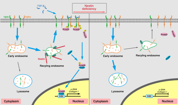 圖1 Nestin促進(jìn)TβRI循環(huán)回收進(jìn)而激活TGF-β/Smad 信號(hào)通路