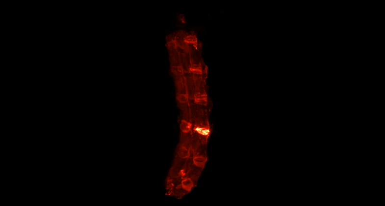 小鼠損傷腰椎的熒光三維成像。熒光信號最高的區(qū)域為被損傷的椎間盤,組織中的膠原蛋白被大量破壞。