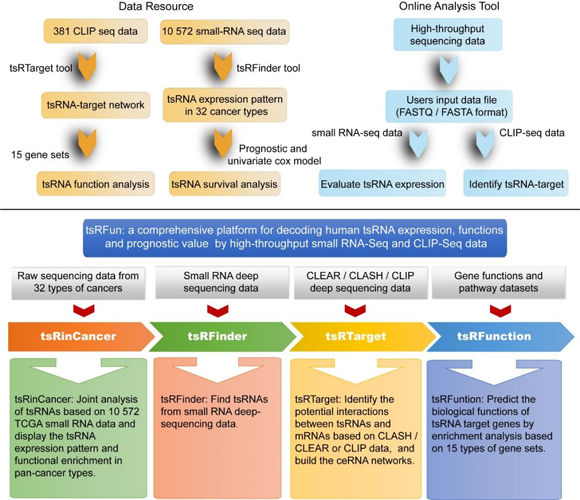 近年來,伴隨著高通量RNA-Seq及CLIP-Seq技術的大規模興起,tsRNA在人類重大疾病中的診療價值進一步得到了體現。然而,針對細胞內tsRNA功能機制的解析始終存在困難。近日,該團隊鄭凌伶副教授利用細胞功能組學技術及數學建模方法,開發了全面的tsRNA功能解析及應用分析平臺:tsRFun (http://biomed.nscc-gz.cn/DB/tsRFun/ 或 http://rna.sysu.edu.cn/tsRFun/)(圖2)。該工具整合了包括轉錄組、靶標組、修飾組在內的多組學測序數據,利用統計學模型鑒定了正常和疾病細胞類型中的tsRNA表達模式,并揭示了它們在細胞內的調控網絡及其在人類32種癌癥中的診斷價值,為tsRNA研究領域提供了豐富的數據資源及有力的分析工具。