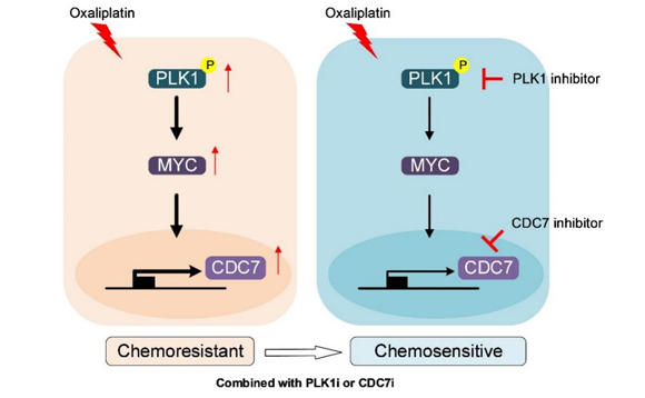 圖1 靶向抑制PLK1-MYC-CDC7信號通路可以有效提高奧沙利鉑敏感性的治療策略