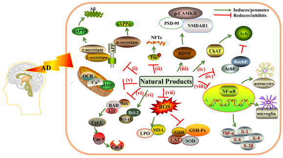 全球估計有3000萬人患有癡呆癥,其中大多數是阿爾茨海默癥(Alzheimer’s disease,AD)患者,AD已成為21世紀全球健康和公共衛生的主要問題之一。盡管臨床上有一些治療AD的藥物,但其療效不理想,而且存在一定的副作用,如肌肉痙攣、頭痛、嗜睡和心律失常等。因此,迫切需要新的防控策略來減緩AD的發生。水果、蔬菜、草藥、堅果、茶和大型真菌等天然產物具有很高的營養價值,其中一些天然產物在預防和治療AD方面有著巨大潛力,如蘋果、藍莓、葡萄、辣椒、淫羊藿、海參、綠茶和普洱茶等。天然產物對AD有益效應的潛在機制包括減少Aβ沉積、抑制Tau蛋白過度磷酸化、緩解突觸功能障礙、降低AchE和BuchE活性、增加ChAT活性、抑制細胞凋亡、改善線粒體功能、減輕氧化應激、改善炎癥和重塑腸道菌群等。本文為天然產物在預防和治療AD方面的潛在應用提供了理論依據和新的視角。