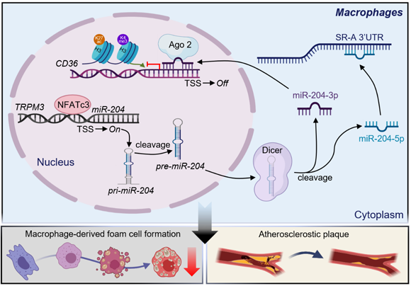 該研究發(fā)現(xiàn)動脈粥樣硬化斑塊中巨噬細胞核中NFATc3表達降低。同時,循環(huán)外周血單核細胞中的 NFATc3 水平與動脈粥樣硬化患者的疾病嚴重程度呈負相關(guān)。通過在體動物實驗發(fā)現(xiàn),巨噬細胞特異性敲除NFATc3可促進動脈粥樣硬化發(fā)展,過表達NFATc3則抑制動脈粥樣硬化形成,但并不影響血脂水平。機制分析發(fā)現(xiàn)NFATc3主要通過抑制清道夫受體SR-A和CD36的表達,進而抑制巨噬細胞的脂質(zhì)沉積和泡沫化。有趣的是,NFATc3作為轉(zhuǎn)錄因子并不直接與SR-A和CD36基因啟動子區(qū)結(jié)合調(diào)控其表達。鑒于miRNA能抑制靶基因的表達,研究者推測NFATc3可能通過調(diào)控miRNA表達抑制SR-A和CD36的水平。通過多組學(xué)綜合分析發(fā)現(xiàn)NFATc3能夠明顯上調(diào)miR-204-5p和miR-204-3p的表達。通過熒光素酶實驗和啟動子序列缺失實驗分析檢測到NFATc3結(jié)合在miR-204基因進化保守位點上游-1.5 kb處,并靶向調(diào)節(jié)miR-204的轉(zhuǎn)錄,且miR-204能抑制巨噬細胞的脂質(zhì)沉積和泡沫化。