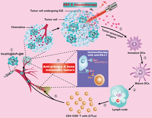 該細胞遞藥系統(tǒng)具有載藥量高、細胞活力高、遞藥效率高及藥物可控釋放等特性,于體內(nèi)可同步靶向到原發(fā)瘤及骨轉(zhuǎn)移瘤區(qū)域(如圖所示)。在原發(fā)腫瘤部位進行近紅外光照射,可激活光敏活性分子的光動力治療,實現(xiàn):①可控觸發(fā)并加速奧沙利鉑從細胞載體中的釋放,發(fā)揮其誘導細胞免疫原性死亡(immunogenic cell death, ICD)功能;②化療與光動力治療的聯(lián)合,不僅顯著抑制原發(fā)腫瘤,且能聯(lián)合誘導ICD的發(fā)生激活免疫系統(tǒng),促進樹突狀細胞(dentritic cells, DCs)成熟,并促進瘤內(nèi)CD8+T細胞和CD4+T細胞的浸潤,同時提高血清中IFN-γ和TNF-α的水平,與PD-L1抗體聯(lián)合后顯著抑制原發(fā)瘤及骨轉(zhuǎn)移瘤,并顯著緩解腫瘤轉(zhuǎn)移導致的骨溶蝕。此外,該化療-光動力-免疫聯(lián)合治療體系賦予了小鼠長期抗腫瘤免疫記憶效應(yīng),并顯著延長了小鼠的生存期,且生物相容性良好。