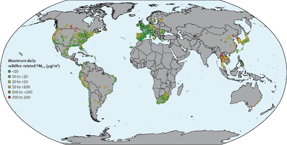 近年來(lái),世界各地頻繁發(fā)生大規(guī)模的野外大火,造成了大量的財(cái)產(chǎn)損失,同時(shí),野火產(chǎn)生的煙霧是細(xì)顆粒物(PM2.5)的重要來(lái)源,與城市來(lái)源的PM2.5相比,野火來(lái)源的PM2.5由于其復(fù)雜的化學(xué)成分和更小的粒徑,其毒性更強(qiáng),并且往往與其他有害環(huán)境因素(如高溫)對(duì)人群健康產(chǎn)生共同作用,因此對(duì)人群健康有著重要影響。然而,鮮有研究系統(tǒng)分析和評(píng)價(jià)野火來(lái)源的PM2.5和死亡率之間的關(guān)系。為此,我校公共衛(wèi)生學(xué)院陳功博副教授與澳大利亞莫納什大學(xué)公共衛(wèi)生與預(yù)防醫(yī)學(xué)學(xué)院郭玉明教授及多個(gè)國(guó)家的研究團(tuán)隊(duì)合作,基于全球43個(gè)國(guó)家和地區(qū)749個(gè)城市的每日全死因死亡、心血管疾病死亡和呼吸系統(tǒng)疾病死亡數(shù)據(jù),利用三維化學(xué)傳輸模型GEOS-Chem評(píng)估全球野火來(lái)源PM2.5濃度(圖1),首次系統(tǒng)闡述了全球野火來(lái)源的PM2.5和死亡率之間的關(guān)聯(lián)。