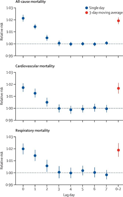 該研究發(fā)現(xiàn),野火來(lái)源PM2.5暴露的3天移動(dòng)平均值(滯后0-2天)每增加10μg/m3,全死因死亡的匯總相對(duì)危險(xiǎn)度(RR)為1.019(95%置信區(qū)間: 1.016-1.022),心血管死亡為1.017(1.012-1.021),呼吸系統(tǒng)死亡為1.019(1.013-1.025)(圖2)。人群歸因百分比結(jié)果顯示,每年有0.62%(95% 置信區(qū)間: 0.48-0.75)的全因死亡、0.55%(0.43-0.67)的心血管死亡和0.64%(0.50-0.78)的呼吸系統(tǒng)死亡可歸因于野火來(lái)源PM2.5的急性暴露。