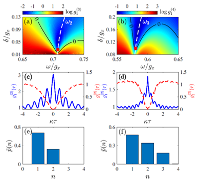 圖1. 基于運動自由度的典型的兩聲子聚束態(左欄)和三聲子聚束態(右欄)的量子統計特性。