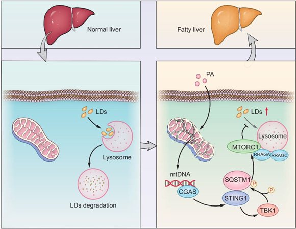 研究團隊通過用棕櫚酸處理細胞來模擬細胞內的脂毒性反應,發現棕櫚酸處理細胞能夠激活STING通路,進一步活化TBK1-P62信號軸來激活mTORC1酶活性,進而顯著抑制細胞內的脂滴降解。敲除STING或者使用雷帕霉素抑制mTORC1酶活性均能夠顯著促進細胞內的脂滴通過溶酶體途徑降解。同時,通過人脂肪肝的組織標本中也證實STING/mTORC1活化程度與肝內的炎癥水平高度相關,與肝細胞內的脂滴數量呈現正相關。這些結果表明STING/mTORC1的活化不僅促進了肝內的炎癥反應,也抑制了肝細胞內的脂滴降解,靶向STING/mTORC1可能作為一種抑制脂肪肝內的慢性炎癥、減少肝細胞內脂肪酸積累的新途徑。