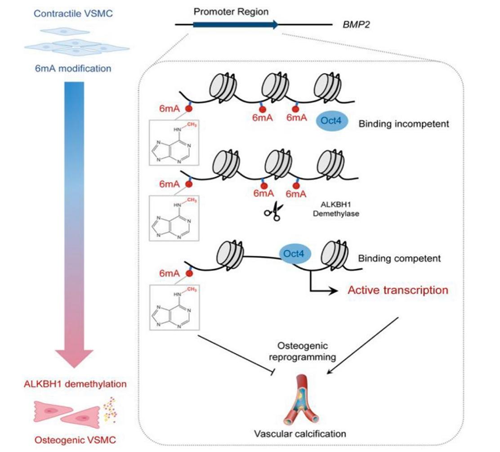 該研究以慢性腎臟病為研究模型,檢測了伴有或不伴有主動脈弓鈣化的患者的白細胞中6mA水平,發現白細胞中6mA水平隨血管鈣化嚴重程度的增加而顯著降低;在血管鈣化患者中,ALKBH1 mRNA和蛋白水平明顯升高,而N6AMT1等表觀遺傳修飾酶表達無明顯差異,表明主要是ALKBH1參與了鈣化過程的6mA修飾調控,這些結果在慢性腎臟病小鼠模型中得以重復。同時,研究者利用敲低或過表達ALKBH1的腺相關病毒感染慢性腎臟病小鼠的動脈,發現敲低ALKBH1會抑制血管鈣化,過表達ALKBH1會促進血管鈣化。進一步發現小鼠原代VSMC在過表達ALKBH1時骨形態發生蛋白2(BMP2)降低,揭示了ALKBH1介導的成骨重編程和鈣化依賴于 BMP2。機制上,ALKBH1去甲基化DNA 6mA修飾可以促進八聚體結合轉錄因子4(Oct4)與BMP2啟動子結合并激活BMP2轉錄,BMP2通過增加骨形成的決定性轉錄因子RUNX2表達來促進VSMC成骨重編程和血管鈣化,該分子機制進一步通過平滑肌特異性敲除Oct4所驗證。