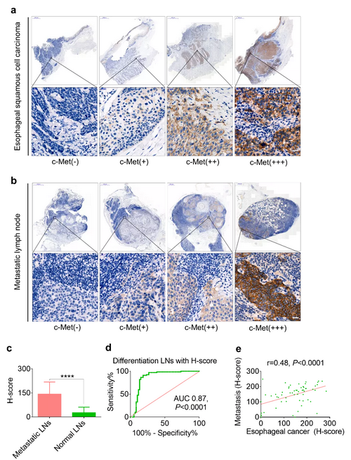 圖1:原發食管癌(a)及轉移淋巴結(b)c-Met染色情況,轉移淋巴結c-Met表達水平顯著高于正常淋巴結(c),c-Met表達水平對于良惡性淋巴結具有較好的區分度(d),而且原發腫瘤與轉移淋巴結的c-Met表達水平呈正相關性(e)。