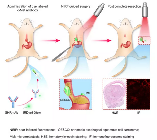 近日,我校附屬第五醫院單鴻教授、李丹副研究員、曹慶東教授科研團隊構建了c-Met靶向NIRF探針,為食管癌術中精準識別微浸潤灶和轉移淋巴結提供了新策略。研究人員通過對食管癌生物標記物進行篩選,證明食管癌患者97.64%(124/127)原發腫瘤及91.67%(55/60)轉移淋巴結表達細胞間充質上皮轉化因子(c-Met)。因此,針對該靶點設計分子探針,有望實現食管癌和轉移淋巴結的特異成像(圖1)。