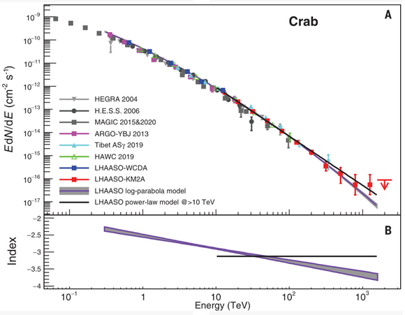 7月9日,我校多名學者參與的LHAASO實驗在Science期刊上以“PeV gamma-ray emission from the Crab Nebula”為題發表了一項改寫教科書的工作,即在世界上率先對蟹狀星云這一“標準燭光”做出了超高能區的精準測量,相較于其他伽馬觀測實驗,LHAASO將觀測的能量范圍延伸到了100TeV以上,并首次發現了其高達1.1PeV超高能的光子,為超高能伽馬光源的測定提供了亮度標準。