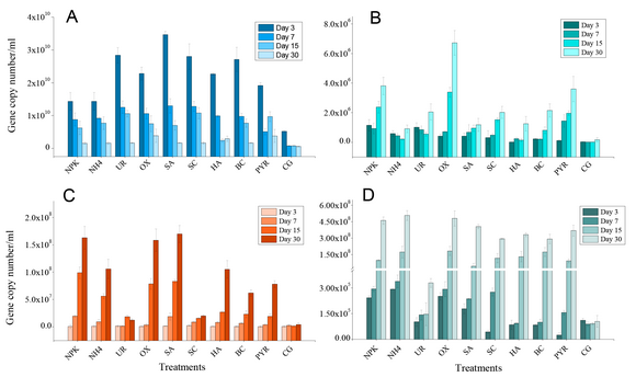 近期,我校生命科學學院李文均教授團隊利用16S rRNA擴增子測序和qPCR技術,在珠江沉積物微觀環境中,探討了不同生物刺激劑對芘降解、原核生物群落組成和功能的影響(圖1-3)。結果表明,對照組、PYR(僅含芘)和生物刺激劑添加組的原核生物群落組成差異顯著(p<0 .05)。生物刺激劑中,生物炭、草酸、水楊酸、npk和硫酸銨均可增強微生物群落對芘的降解潛力。黃桿菌屬(Flavobacterium)、氫噬菌屬(Hydrogenophaga)、分枝桿菌屬(Mycobacterium)、紅球菌屬(Rhodococcus)、黃腐桿菌屬(Flavihumibacter)、假單胞菌屬(Pseudomonas)、新鞘脂菌屬(Novosphingobium)等在所有實驗組中占主導地位,表明這些屬在芘代謝中起著重要作用。基于較高的GP-RHD和nidA基因豐度,我們推測革蘭氏陽性的原核生物群落比革蘭氏陰性的原核生物群落更能分解芘。此外,NPK和SA處理中nifH和pqqC基因顯著更豐富的證據表明,不同的生物刺激劑可能富集某些細菌組合。此外,NPK、OX(草酸)、UR(尿素)、NH4、和SC(水楊酸鹽)組也表明,不同的生物刺激劑可能對原核生物群落演替產生不同的生態影響。本研究為生物刺激法降解芘的研究提供了新的思路。因此,在設計生物刺激技術時,研究群落結構和功能及其對退化的影響同樣重要。