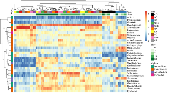 圖1. 熱圖顯示了30個高豐度屬在不同處理和時間點的分布和豐度