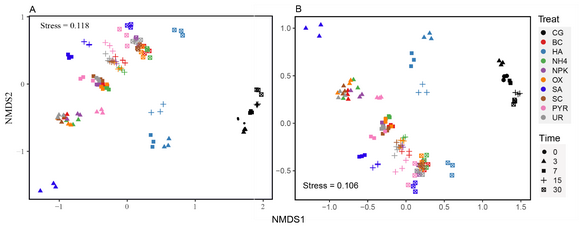 圖2. NMDS分析基于(A) Bray Curtis (B) Jaccard不同相似性矩陣表示不同時間點處理的原核群落組成