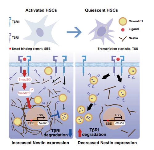 針對這一臨床難題,張琪教授的生物治療中心團隊、楊揚教授的肝臟移植團隊與項鵬教授的干細胞研究團隊歷時五年合作,從基礎研究發現到臨床組織標本驗證,發現中間絲蛋白家族成員巢蛋白(Nestin)不僅參與細胞骨架形成和細胞形態維持,更是肝纖維化、肝硬化過程中肝星狀細胞活化的關鍵調控分子,Nestin可通過調控Caveolin1影響TβRI降解速率在促纖維化主要通路TGFβ-Smad2/3信號通路激活中發揮重要作用,下調Nestin表達可顯著緩解組織纖維化的癥狀,為減輕或逆轉肝纖維化提供了潛在靶點。該研究首次揭示了Nestin在肝纖維化進程中的生理功能與調控網絡,為肝纖維化防治提供了重要的理論依據。
