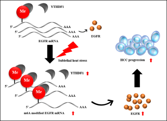 體外功能實驗發(fā)現(xiàn)在亞致死性熱刺激條件下,YTHDF1可促進HCC細胞的生長、侵襲及轉移,而在小鼠尾靜脈肺轉移模型及肝包膜下注射的原位HCC模型中則發(fā)現(xiàn)敲除YTHDF1可顯著減少由亞致死性熱刺激引起的HCC肺轉移。進一步機制研究發(fā)現(xiàn),亞致死性熱刺激上調表皮生長因子受體EGFR mRNA 5’UTR的m6A修飾水平,進而促進YTHDF1與癌基因EGFR的mRNA結合并上調其蛋白表達水平,導致RFA后HCC的復發(fā)轉移。EGFR蛋白水平的增加在PDX小鼠HCC消融模型和消融患者的HCC組織中均得到驗證。