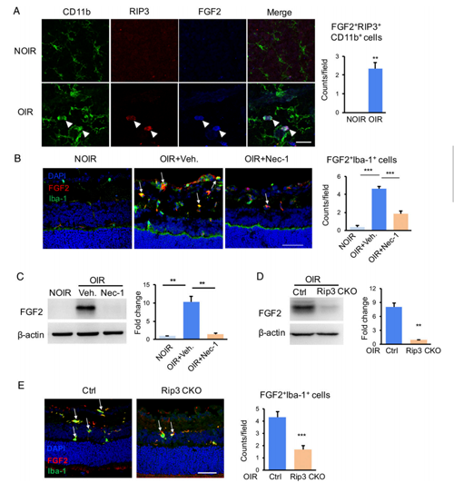 為了進一步探究RIP3+小膠質細胞程序性壞死是如何介導視網膜新生血管形成,研究人員利用Luminex高通量多因子檢測技術篩選促血管生成因子的表達情況,發現FGF2在OIR模型中上調最為顯著。進一步在OIR小鼠視網膜中明確,RIP3+小膠質細胞高表達FGF2,且當應用RIP1抑制劑Nec-1和利用RIP3 CKO的功能缺失策略時,FGF2表達釋放明顯減少。提示RIP3+小膠質細胞可通過程序性壞死釋放FGF2(圖三)。