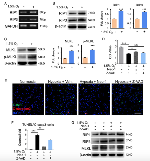 同時,研究人員在體外培養小鼠原代小膠質細胞和小膠質細胞系,再次證明低氧環境可誘導小膠質細胞上調RIP1/RIP3/MLKL發生程序性壞死,并發現該過程可被RIP1抑制劑Nec-1阻斷(圖二)。