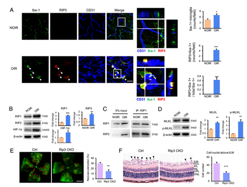 在這項研究工作中,研究人員運用單細胞轉錄組測序技術在小鼠氧誘導視網膜新生血管(OIR)模型中進行小膠質細胞亞群分類分析,發現OIR中有一群特殊的以RIP3+為特征的小膠質細胞亞群,并通過視網膜鋪片的免疫熒光染色,研究人員在新生血管周圍觀察到該群Iba1+ RIP3+小膠質細胞,進一步驗證了單細胞測序中發現的程序性壞死的小膠質細胞亞群。接下來,利用小膠質細胞特異的RIP3條件敲除小鼠(RIP3 CKO)造模,發現其新生血管明顯減少,明確了該亞群細胞介導病理性視網膜新生血管形成(圖一)。