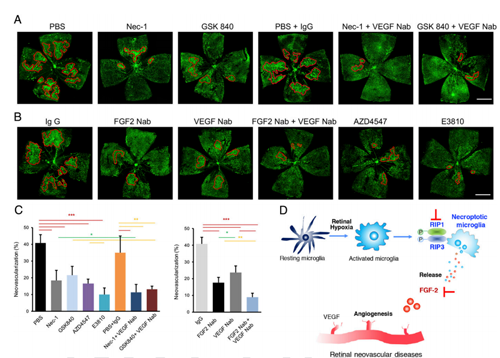 以上研究證明,在低氧刺激下,視網膜小膠質細胞RIP3+亞群發生RIP1/RIP3/MLKL依賴的程序性壞死,釋放FGF2,從而促進視網膜新生血管。基于此,我們提出了聯合抗程序性壞死和抗VEGF治療視網膜新生血管的新策略。動物實驗結果顯示,聯合治療效果顯著(圖四)。