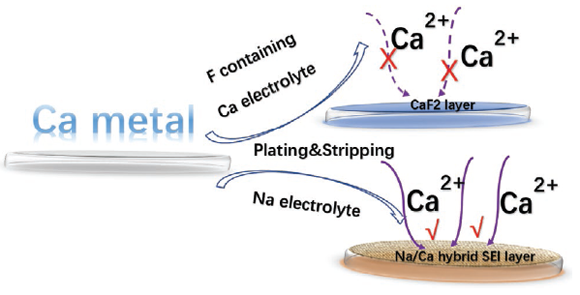有鑒于此,中山大學材料科學與工程學院王成新教授團隊首次引入Na/Ca復合固態電解質中間相,用于解決鈣金屬在電化學沉積/剝離過程中的失控氟化和沉積電位漂移現象;如下圖所示為核心思想示意圖,通過在鈣金屬表面形成穩定、致密的Na/Ca復合固態電解質中間相界面保護層,從而成功遏制電導絕緣性CaF2不斷形成。