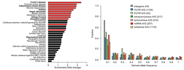 圖示:(左)RNA編輯SNP位點(diǎn)高度富集在以克羅恩病,哮喘和過敏性皮炎為代表的自身免疫疾病關(guān)聯(lián)位點(diǎn)附近;(右)RNA編輯SNP位點(diǎn)的基因頻率富集在中頻區(qū)段人類免疫功能相關(guān)的基因在人類進(jìn)化中受到強(qiáng)烈的平衡選擇,暗示其受到平衡選擇。