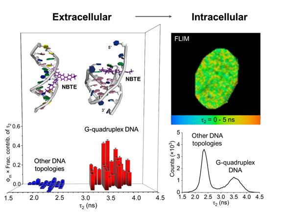眾所周知,DNA是儲存和傳遞遺傳信息的場所,是許多疾病的主要藥物靶點。其中富含鳥嘌呤的寡核苷酸可以自組裝形成兩層或多層的的G-四鏈體結構。G-四鏈體DNA可以在特定的細胞環境和細胞周期自組裝形成以執行特定的生物學過程,包括DNA復制、基因表達、基因組穩定性和端粒生物學等。為了進一步闡明G-四鏈體DNA的結構-功能關系及其在癌癥診斷和治療中的潛在應用,迫切需要發展對體內G-四鏈體DNA的可視和定量探測方法。然而由于G-四鏈體DNA具有結構多態性等因素,實時定量檢測體內G-四鏈體DNA結構仍然具有挑戰性。