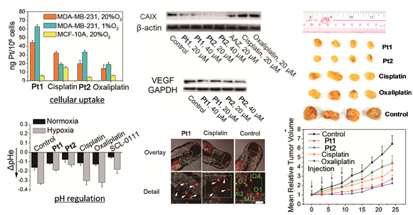 金屬鉑類藥物是臨床抗腫瘤聯合治療的一把利器,如何提高鉑類藥物的靶向性、降低其毒副作用、克服耐藥性、增強抗癌效果一直是科學家們致力解決的問題。缺氧和酸性微環境是實體瘤的典型特征,在促進腫瘤侵襲、轉移和血管生成方面發揮著重要作用。因此,調節腫瘤缺氧和酸性微環境為新型鉑類藥物的設計提供了一個誘人的切入點。