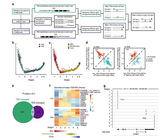 以人胚胎干細胞來源的視網膜類器官為研究對象,通過對10571個單細胞進行測序分析,該研究描繪了視網膜祖細胞(RPC)向光感受器前體細胞(PR precursors),進一步向視錐細胞(cone)分化的轉錄異構體的表達圖譜,發現轉錄異構體變化最顯著的時間點發生在RPC向光感受器前體細胞轉變的節點。該研究還發現CCND1異構體可能通過調節細胞周期,介導RPC向光感受器前體細胞的命運轉換(圖4)。