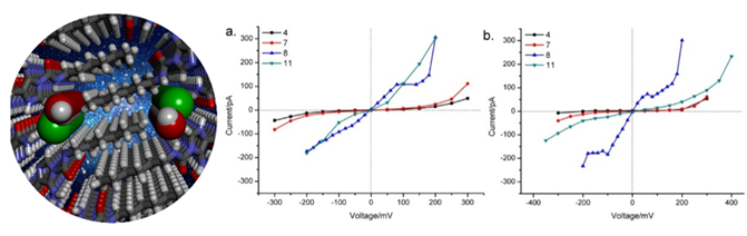 基于磷脂膜的離子傳輸熒光實驗確認了這種咪唑組裝型通道的pH調節氯離子傳輸行為,包括離子傳輸機理(H+/Cl-協同傳輸或OH-/Cl-交換傳輸),氯離子傳輸過程速率與ΔpH的關系。結合pH響應氯離子傳輸過程行為分析、溶液紫外-可見光化合物穩定性測試和氯離子結合核磁實驗,他們進一步推測不同溶液pH可能誘導產生不同的氯離子結合組裝構象行為:由Imu3H+·Cl-晶體結構可知,在酸性環境中,氯離子會以[H2O·Cl-]的結合模式沿部分質子化構象的組裝通道方向性流動;若溶液pH切換至堿性狀態,咪唑型分子的組裝行為會發生調整,轉化為一種全新的中性通道組裝構象,同時氯離子也會以一種合理的假想水合模式[-OH·H2O·Cl-]在離子-位點的多重吸引-排斥協同作用的驅動下跳躍式前進。隨后,不同pH電導液的膜片鉗實驗明確肯定了基于咪唑型分子的離子通道傳輸機制和其pH-電壓雙刺激響應型的離子傳輸特性(右圖)。