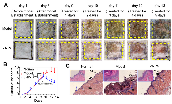 圖2. 外用cNP治療銀屑病食蟹猴的結(jié)果:(A)皮損表觀變化;(B)PASI得分;(C)皮損組織切片HE染色