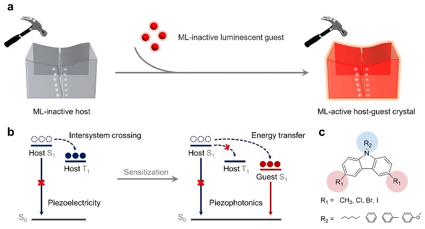 近日,中山大學化學學院池振國教授研究團隊提出利用一種更加簡單的方法來精準設計力致發光復合材料體系的新設計策略。該策略設計的力致發光復合材料體系中,單獨的主體材料和客體材料都不具有力致發光性能,但是通過主客體復合得到的復合體系則具有力致發光性能,實現了從無到有的力致發光。同時,客體材料的選擇范圍非常廣,可以是純有機發光材料、配合物磷光材料,也可以是無機量子點發光材料等等。通過改變客體材料的種類,非常容易調節力致發光的發光顏色、亮度、色純度以及發光壽命等性能,極大地豐富了力致發光材料的研究內涵。結合光物理測試和理論計算,深入探究這類新型力致發光復合體系的激發過程和發射過程,并揭示了復合體系力致發光的激活機制是源于壓電效應和主客體分子的能量轉移。