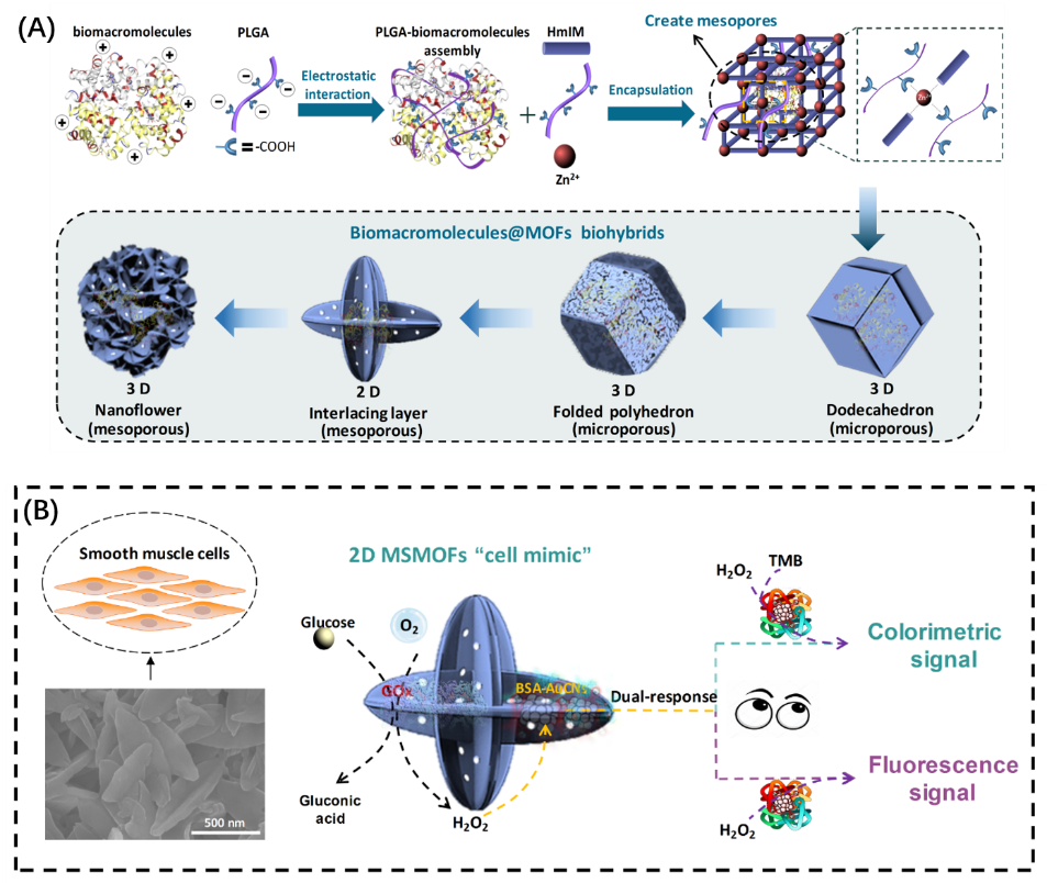 圖(A)聚多肽導向的酶@ZIF-8雜交材料合成示意圖;圖(B)葡萄糖雙重響應的MOFs“人造細胞”