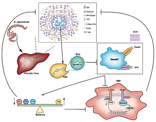 血吸蟲侵入人體后,在肝門靜脈及腸系膜內(nèi)寄生,最后發(fā)育為成蟲,雌雄成蟲交配后,雌蟲產(chǎn)卵后,蟲卵隨門靜脈系統(tǒng)流至肝門靜脈并沉積在肝組織內(nèi),從而引發(fā)宿主免疫反應(yīng),引起肉芽腫性炎癥以及纖維化反應(yīng)。同時,宿主的纖維化反應(yīng)會導致蟲卵鈣化并加速其死亡。因此,蟲卵肉芽腫和纖維化是血吸蟲病的病理學基礎(chǔ)。已有研究提示,血吸蟲蟲卵可以分泌某些物質(zhì)來限制宿主的肝組織纖維化進程,進而延緩其死亡,有助于血吸蟲完成其生活史,但具體的分子機制是什么并不清楚。通過本研究發(fā)現(xiàn),日本血吸蟲蟲卵來源的外泌體可以通過抑制肝星狀細胞活化,減輕日本血吸蟲感染的病理進展和肝纖維化的進展,并證實這個過程與蟲卵來源的外泌體高表達Sja-miR-71a相關(guān)。Sja-miR-71a通過直接靶向Sema4D抑制TGF-β1/ SMAD和IL-13/STAT6途徑以及調(diào)節(jié)Th1 / Th2 / Th17和Treg平衡來抑制肝纖維化。本項研究加深了對血吸蟲-宿主相互作用分子機制的理解,并提示Sema4D可能是抗血吸蟲病肝纖維化治療的潛在靶標,從而為肝纖維治療提供新的思路。