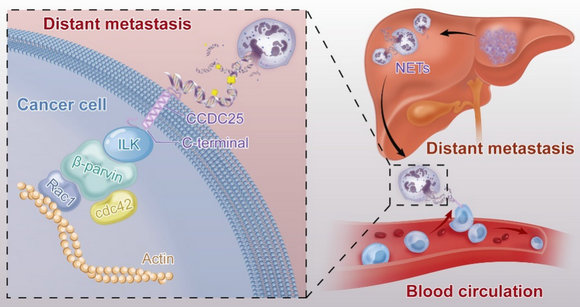 在機制方面,該課題組發現NET-DNA可以充當趨化腫瘤細胞運動的趨化因子,在不同小鼠模型中,發現肝臟或者肺組織中的NETs可吸引腫瘤細胞導致遠處轉移的發生。進一步研究發現,腫瘤細胞膜上存在NET-DNA受體CCDC25,CCDC25通過識別胞外的NET-DNA,激活ILK-β-parvin細胞骨架信號通路,增強腫瘤細胞的運動。既往研究認為DNA感受器主要位于胞內,該研究首次發現存在細胞膜上的DNA感受器。