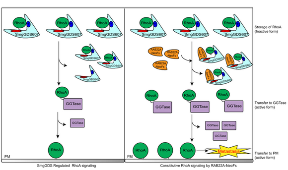 我校腫瘤防治中心康鐵邦教授、附屬第一醫院沈靖南教授、蘇州大學陳堅教授等研究團隊合作,在骨肉瘤細胞系和腫瘤組織中,發現了幾個與RAB22A1-38相關的融合基因,其融合蛋白(Rab22a-NeoFs)可結合SmgGDS607,促進RhoA的活化,從而促進骨肉瘤的肺轉移,并合成了特異靶向的穿模多肽,可阻斷該融合蛋白的功能,為骨肉瘤肺轉移的靶向治療提供了一個新的潛在靶標。同時,這類RAB22A1-38相關的融合基因在乳腺癌、肺癌的細胞系和/或腫瘤組織中也存在,并促進腫瘤轉移,拓展了該治療靶標的臨床意義。研究成果于2020年6月1日,以Article形式在線發表于國際知名學術期刊《自然細胞生物學》(Nature Cell Biology),期刊最新影響因子為20.761。