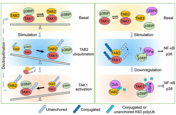 在該研究中,李迎秋教授課題組發現p38IP蛋白抑制多種免疫受體信號通路,其中包括TCR受體信號通路和LPS信號通路,且在自身免疫疾病類風濕關節炎患者外周血單個核細胞中p38IP蛋白水平顯著下調。研究進一步揭示,p38IP采用雙重調控方式抑制免疫受體信號通路中的關鍵蛋白激酶TAK1活性:(1)通過競爭性結合TAK1從而解離TAK1-TAB2激酶復合物。TAK1的活化主要依賴于其結合蛋白TAB2介導的非錨定多聚泛素鏈與TAK1的結合。由于p38IP的競爭性結合,阻斷了TAK1與TAB2及其結合的多聚泛素鏈的接觸,從而抑制TAK1活化。TAK1-p38IP復合物與TAK1-TAB2復合物在靜息細胞中達到一定的平衡。有趣的是,免疫信號刺激會誘導p38IP與TAK1發生瞬時解離,利于促進TAK1活化,之后再結合,從而抑制TAK1過度活化。究其動態結合原因,發現非錨定多聚泛素鏈可以像接力棒般從TAB2向TAK1傳遞;還發現TAB2和TAK1結合泛素鏈之后分別對TAK1和p38IP有更強的結合親和力。在這兩種因素的交織作用下,刺激誘導p38IP與TAK1發生動態結合,精確調控TAK1活化。(2)免疫信號刺激后,p38IP還作為接頭蛋白特異性地將去泛素化酶USP4招募到活化的TAK1,去除TAK1上共價和非共價結合的泛素鏈。因此,p38IP可通過感應TAK1活性,精準調控TAK1活化,從而防止免疫信號的過活化。本研究不僅發現了新的免疫受體信號通路負性調控因子,也為認識p38IP生物學功能提供了新視角。