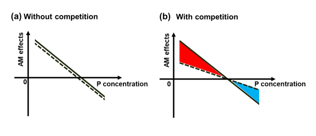 AMF能與超過80%的陸生植物結合,是一類對植物生長有促進作用的有益真菌。大多數外來植物不僅能迅速地與入侵地AMF結合,而且能破壞本地植物與AMF共生關系。因此,AMF一直被認為是促進外來植物入侵的一個重要生物因子。然而,以往的研究表明AMF與植物的相互作用具有磷元素依賴性。低磷濃度時,AMF促進植物生長;而高磷濃度時,AMF抑制植物生長。因此,磷濃度很可能是影響AMF對外來植物入侵促進作用的重要因子。該研究通過對兩種華南入侵植物假臭草(Eupatorium catarium)和三葉鬼針草(Bidens pilosa)及其伴生的本地種進行室內控制實驗,發現:隨著磷濃度增加,AMF對入侵植物和本地植物生長作用都由促進轉向抑制(圖a)。混種時,入侵植物抑制了本地植物與AMF結合,導致在低磷濃度時削弱了AMF對本地植物生長的促進作用;而在高磷濃度時削弱了AMF對本地植物生長的抑制作用(圖b)。因此,AMF對外來植物入侵促進的作用隨著磷濃度升高而減弱。