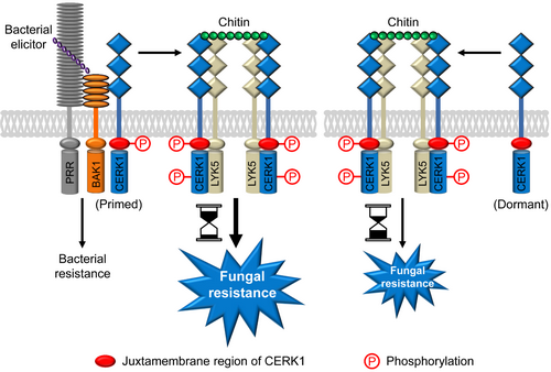 李劍峰教授團(tuán)隊(duì)的研究首次發(fā)現(xiàn)擬南芥BAK1和CERK1分別作為共受體的兩條過去認(rèn)為彼此獨(dú)立的免疫信號轉(zhuǎn)導(dǎo)通路存在信息流動(dòng)(crosstalk),并因此產(chǎn)生細(xì)菌誘導(dǎo)的真菌抗性。同時(shí),該研究首次發(fā)現(xiàn)植物受體激酶可通過近膜區(qū)磷酸化進(jìn)入一種介于“失活”和“激活”的中間狀態(tài),即“警戒”(primed)狀態(tài)。值得注意的是,茄科植物本氏煙的CERK1因?yàn)榻^(qū)沒有對應(yīng)擬南芥CERK1的可磷酸化位點(diǎn),不能響應(yīng)flg22進(jìn)入警戒狀態(tài),而擬南芥的CERK1卻能在本氏煙細(xì)胞中受flg22誘導(dǎo)進(jìn)入警戒狀態(tài),提示通過基因編輯改造農(nóng)作物自身CERK1的近膜區(qū)使之獲得對應(yīng)擬南芥CERK1的可磷酸化位點(diǎn),有望成為提升農(nóng)作物廣譜真菌抗性而又不會(huì)造成持續(xù)生長抑制的新策略。