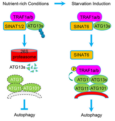 肖仕教授課題組通過精細的遺傳學和生物化學分析,發現自噬蛋白激酶復合體成員ATG1和ATG13蛋白在營養缺陷及恢復條件下,其穩定性受26S蛋白酶體動態調控。在正常生長條件下,E3泛素連接酶SINAT1和SINAT2與自噬起始復合體中的ATG13蛋白相互作用,通過K48連接的泛素化修飾,促進ATG13蛋白的降解,從而抑制自噬過程的發生。在營養缺陷條件下,SINAT6則通過競爭性結合ATG13,抑制ATG13蛋白的泛素化降解,促進自噬發生。深入研究表明,ATG13a蛋白中K607和K609兩個關鍵的賴氨酸殘基對于其泛素化及抑制自噬發生至關重要。進一步,研究發現TRAF1a和TRAF1b作為接頭分子,參與了SINAT1/SINAT2及SINAT6對ATG13蛋白的穩定性調控。同時,該研究揭示了ATG1蛋白通過磷酸化修飾,在營養缺陷條件下反饋調節TRAF1接頭分子蛋白的穩定性,進一步維持植物自噬發生水平的穩態(如上圖所示)。與其生理功能一致,擬南芥atg1a atg1b atg1c三突變體表現出提前衰老、對營養缺陷異常敏感、及TRAF1a蛋白穩定性下降的表型。該論文揭示了擬南芥SINAT家族蛋白通過介導ATG13蛋白的泛素化修飾和穩定性,影響植物自噬發生的分子機制,具有重要的科學意義。
