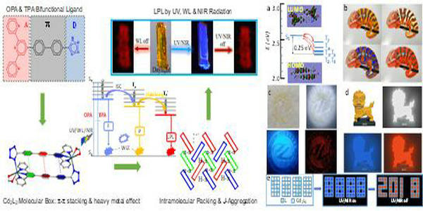 近日,我?;瘜W學院潘梅教授課題組另辟蹊徑,設計了一種基于D-π-A型配體的金屬-有機超分子盒。配體的電子結構賦予其同時具有良好的單光子吸收(OPA)和雙光子吸收(TPA)的雙路徑發光特性。在配體與Cd(II)組裝構筑的M2L2超分子盒中,配體的雙路徑發光得以保持,并通過金屬中心的重原子效應,以及超分子組裝中的π堆積和J聚集態得以強化、放大和優化。在該配位超分子盒材料中,不僅可以利用紫外(UV)或可見白光(WL)激發的OPA路徑,同時可以有效利用低能近紅外光(NIR)激發的TPA路徑,經由不同激發單重態到三重態之間的能量轉移過程,實現了藍色熒光(F)、黃色磷光(P)、組合白光(WLE)、以及紅色長余輝發光(LPL)的豐富發光現象。由此,在金屬-有機材料中,首次獲得了同時具有紫外、可見白光和近紅外光的廣譜光能蓄水池,并由此觸發紅色長余輝的多功能發光材料,可廣泛應用于隱身、防偽、裝飾、顯示等不同領域。