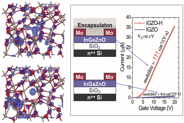 針對以上問題,近期,我校電子與信息工程學(xué)院劉川教授的研究團隊發(fā)現(xiàn),可以通過簡單封裝和熱退火,制備出穩(wěn)定富含氫的IGZO 晶體管,其晶體管電學(xué)性能、穩(wěn)定性都獲得大大提高。制備方法較簡單且重復(fù)性高,即用氮化硅薄膜封裝,再通過熱擴散將氮化硅內(nèi)氫元素擴散至InGaZnO薄膜內(nèi)。摻氫后的晶體管,其開態(tài)電流和開關(guān)比都獲得了數(shù)量級的提升(約40倍),而且閾值電壓沒有太大變化。而對應(yīng)提取出的場效應(yīng)遷移率則出現(xiàn)異常,大于300 cm2/(V·s),遠(yuǎn)高于未經(jīng)處理的對照樣品。然后結(jié)合二次離子質(zhì)譜儀(SIMS)和X射線光電子能譜分析(XPS)表征,發(fā)現(xiàn)薄膜內(nèi)不但氫濃度提升了約一個數(shù)量級,而且氧空位缺陷態(tài)也大大減少了,而自由電子濃度則相應(yīng)顯著增加。