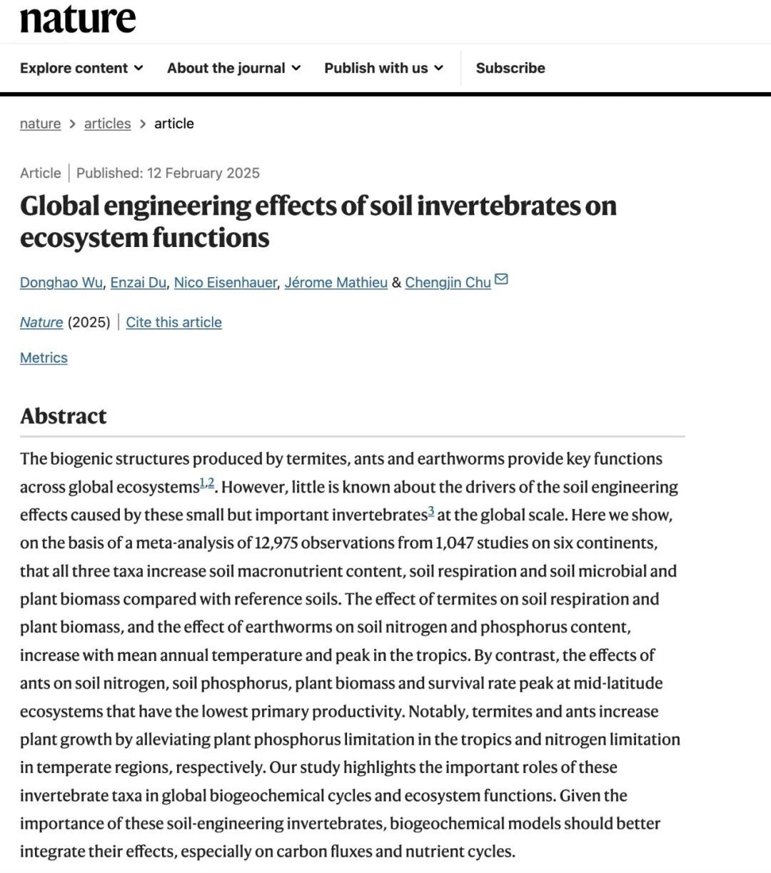 中大新聞網(wǎng)訊 2月12日,中山大學生態(tài)學院儲誠進教授團隊在《自然》(Nature)雜志發(fā)表論文,研究顯示,白蟻、螞蟻和蚯蚓等土壤無脊椎動物具有提升土壤肥力、改善土壤質地和促進作物產(chǎn)量的生態(tài)系統(tǒng)功能,對促進全球元素循環(huán)、物質降解和生物多樣性維持具有重要作用。這一研究為應對氣候變暖和促進生態(tài)修復提供了全新思路。