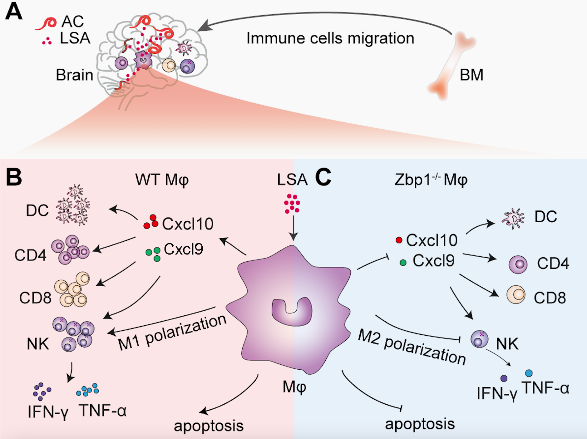 研究團隊發現,在AC所致感染性腦炎模型中,骨髓來源的巨噬細胞Zbp1表達上調,并通過與RIPK3直接結合,激活RIP3-MLKL信號軸,促進巨噬細胞的凋亡、M1極化和趨化因子CXCL9與CXCL10的分泌,進而募集免疫細胞并激活CD8+ T細胞及NK細胞分泌TNF-α和IFN-γ,促進AC感染性腦炎的發生發展。而在AC感染的Zbp1敲除小鼠中,巨噬細胞M2型極化增強,凋亡減輕,淋巴細胞(CD4+ T、CD8+ T)浸潤及NK細胞毒性顯著降低,從而減輕中樞神經炎癥反應。