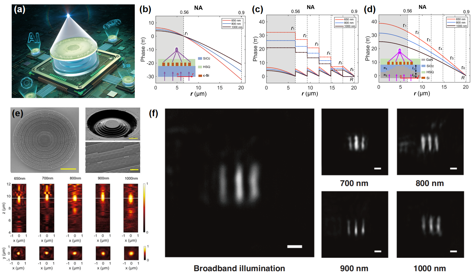 圖1:“高大寬”消色差平面透鏡的物理設計、器件特征、聚焦性能及成像性能